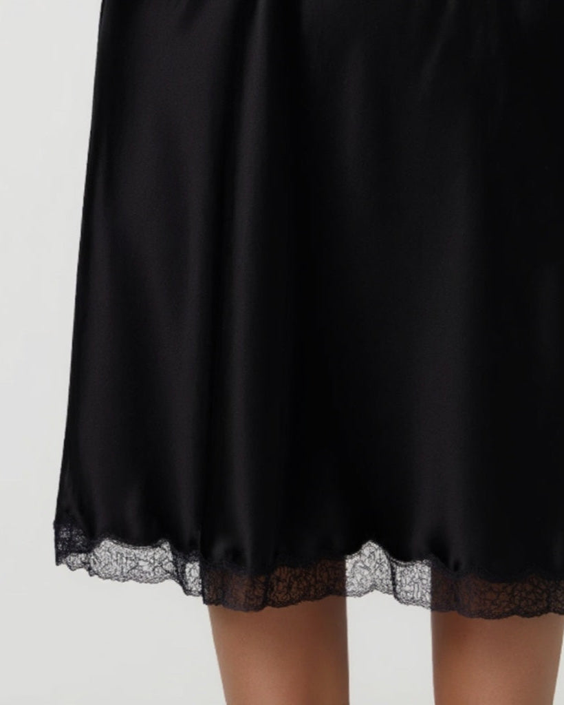 A soft, fluid skirt crafted in black silk, detailed with tonal lace embroidery along the hem. Designed with an elasticated waistband for comfort and ease, the silhouette is simple — falling gently from the waist to just above the ankle. The lace edge adds a quiet romanticism, balancing the clean lines of the silk.